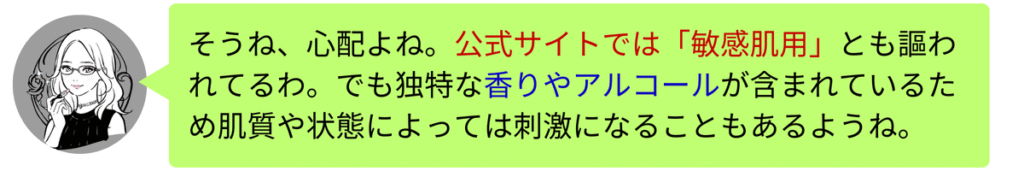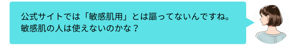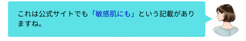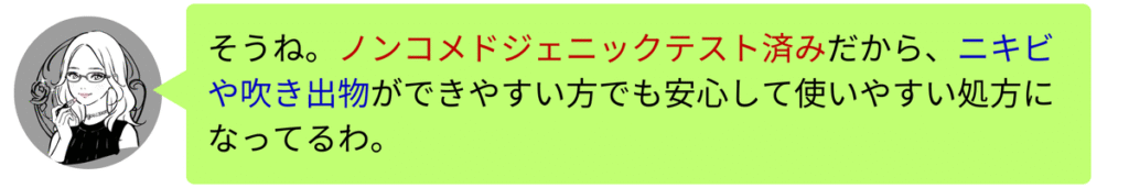 - 公式サイトでも「敏感肌にも」という記載があり、ノンコメドジェニックテスト済みのため、ニキビや吹き出物ができやすい方でも安心して使いやすい処方です。