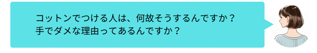実は、私も以前ひどい肌荒れに悩んでいた時期があり、その時に専門家から「手の雑菌で顔が荒れることがあるので、直接手でつけるのではなく、清潔なコットンを使ってください」とアドバイスされた経験があります。