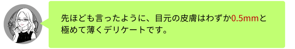 頬などの一般的な顔の皮膚が約2mm前後あるのに対し、まぶた(上まぶたも目の下も)はわずか約0.3mm〜0.6mmしかありません。つまり、目元は顔の中で最も薄く、デリケートな部位なのです。