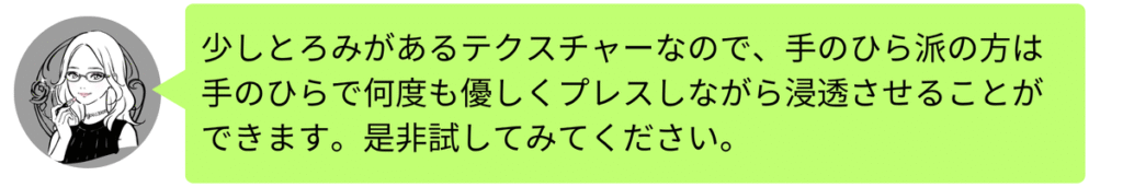 このテクスチャーのおかげか、(私はコットン派なので)コットンで優しくゆっくり浸透させて、肌に摩擦を与えることなくたっぷり潤いを補給できます。